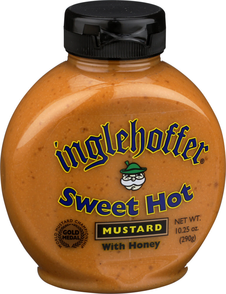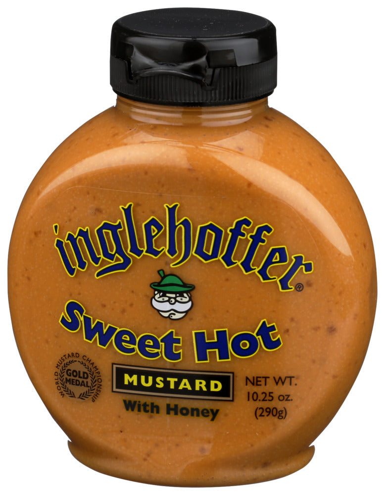 INGLEHOFFER SWEET HOT MUSTARD WITH HONEY IS MADE FROM A BLEND OF VINEGARS, MUSTARD SEED AND HONEY AND SEASONED WITH GARLIC AND PAPRIKA CREATING A SWEET HONEY FLAVOR WITH A SPICY KICK. OUR HONEY MUSTARD HAS ONLY 10 CALORIES PER SERVING AND 0 G. OF TOTAL FAT. THIS BOTTLE CONTAINS 10.25 OZ. OF SWEET HOT MUSTARD.