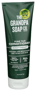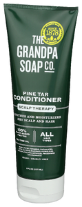 THE GRANDPA SOAP CO. PINE TAR CONDITIONER SOOTHES AND MOISTURIZES DRY SCALP AND HAIR. THIS FORMULA IS FREE OF PARABENS, SULFATES AND ARTIFICIAL FRAGRANCES. IT CONTAINS 100% PLANT-BASED PINE TAR AND TEA TREE OIL. THE TWO WORK TOGETHER TO SOOTHE AND GENTLY CONDITION, LEAVING SCALP HEALTHY AND HAIR MANAGEABLE. A PERFECTLY CLARIFYING FORMULA FOR ALL HAIR TYPES. NATURAL AND GENTLE ENOUGH FOR DAILY USE. INCLUDES ONE 8 FL. OZ. BOTTLE OF CONDITIONER. HARDWORKING, SIMPLE, PURE INGREDIENTS ARE THE HEART OF OUR NATURAL SOAPMAKING TRADITIONS.