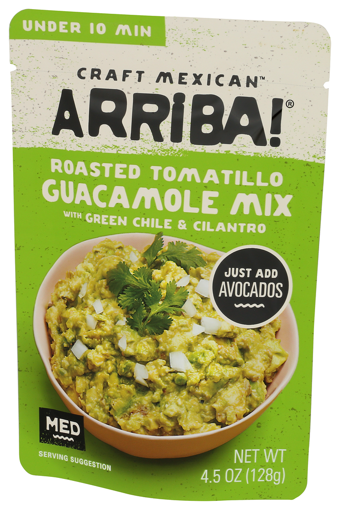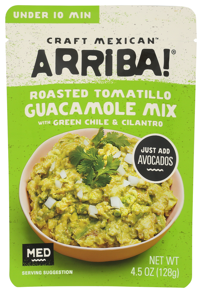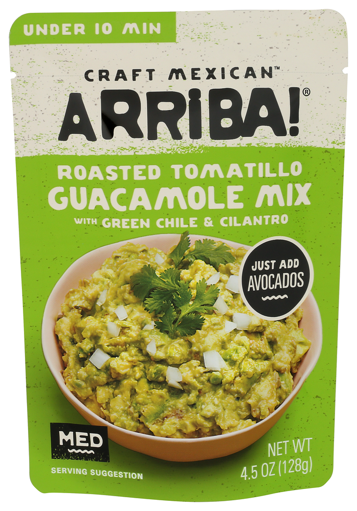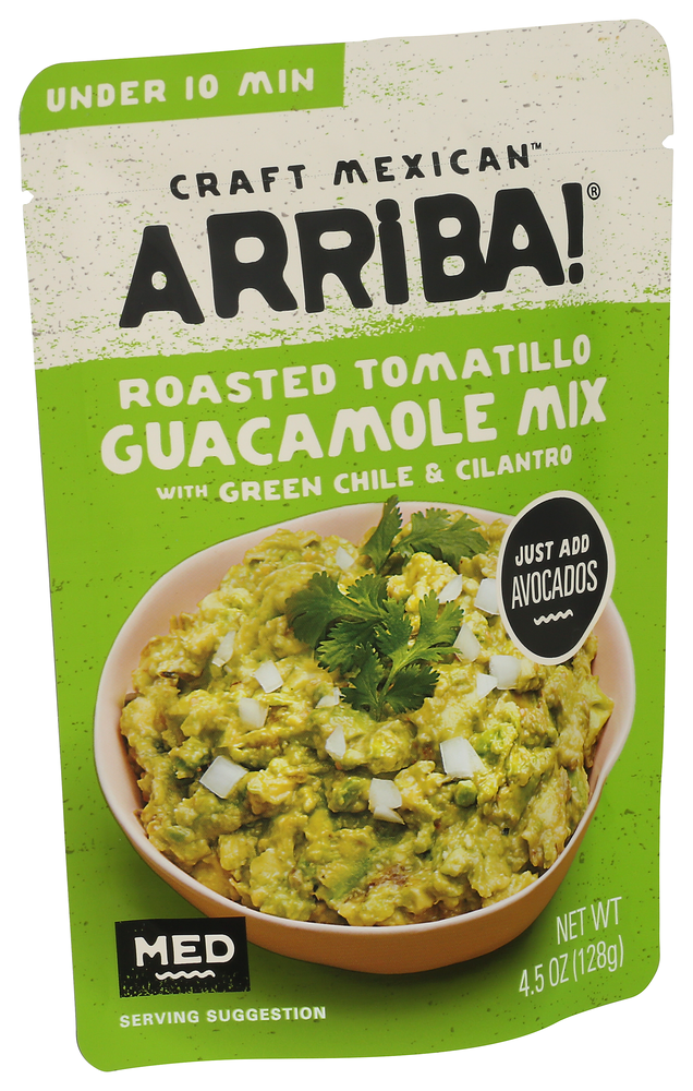 - PERFECT GUAC UNDER 10 MIN HERE WHAT YOU'LL NEED AVOCADO 2 LARGE RIPE AVOCADOS FLAVOR 1 POUCH ARRIBA ROASTED TOMATILLO GUACAMOLE MIX +SALT, CILANTRO AND TORTILLA CHIPS LET'S GET COOKING 1 SCOOP AVOCADOS INTO A BOWL, ADD GUACAMOLE MIX, AND MASH. 2 SEASON WITH SALT, IF DESIRED, TOP WITH FRESH CILANTRO, AND SERVE WITH TORTILLA CHIPS.