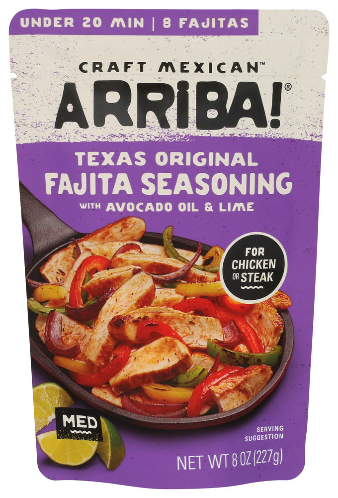 - TEXAS CHICKEN FAJITAS UNDER 20 MIN | MAKES 8 FAJITAS HERE'S WHAT YOU'LL NEED CHICKEN 1-1¼ LB BONELESS, SKINLESS CHICKEN BREASTS, SEASONED WITH SALT ONION 1 MEDIUM ONION, SLICED PEPPERS 2 BELL PEPPERS, SLICED FLAVOR 1 POUCH ARRIBA TEXAS ORIGINAL FAJITA SEASONING + COOKING OIL, WARM TORTILLAS AND FAJITA TOPPINGS LET'S GET COOKING 1 MARINATE CHICKEN IN ½ POUCH OF FAJITA SEASONING FOR 10 MINUTES. 2 MEANWHILE, HEAT 1 TBSP OIL IN A 10-12" SKILLET, SAUTÉ ONION AND PEPPERS UNTIL BROWNED, ABOUT 8 MINUTES. REMOVE TO A PLATE. 3 ADD 1 TBSP OIL, PLACE CHICKEN IN THE SKILLET IN A SINGLE LAYER AND SAUTÉ UNTIL BROWNED AND COOKED THROUGH, ABOUT 4 MINUTES PER SIDE. SLICE INTO STRIPS. 4 LOWER HEAT, ADD REMAINING FAJITA SEASONING, RETURN CHICKEN AND VEGGIES TO SKILLET, STIR TO HEAT THROUGH. SERVE IN TORTILLAS WITH TOPPINGS OF YOUR CHOICE.