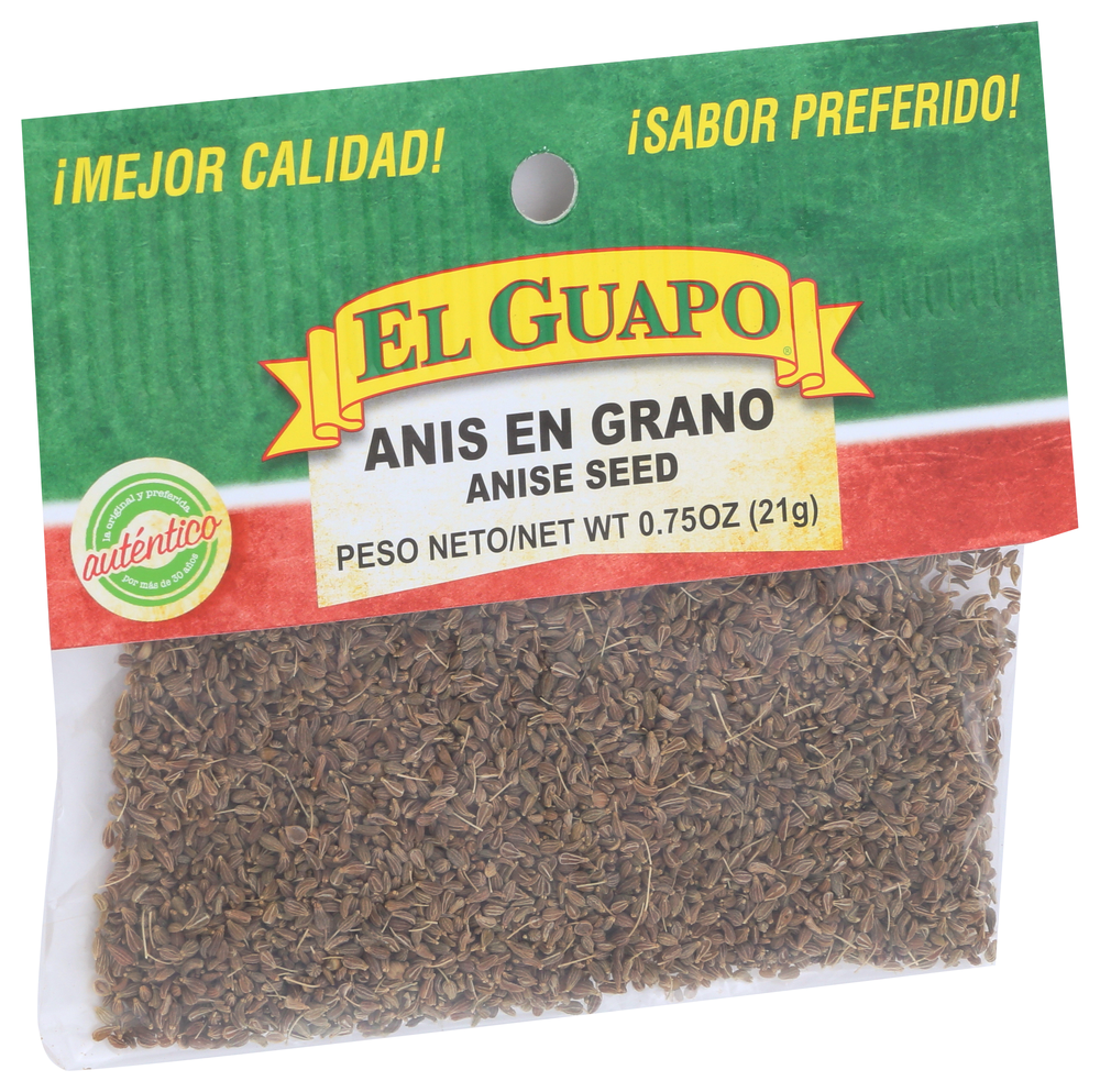 EL GUAPO ANISE SEED ENHANCES YOUR COOKING WITH AUTHENTIC HISPANIC FLAVOR. PRESERVED WHOLE FOR MAXIMUM FRESHNESS AND TASTE, THESE SEEDS LEND DISTINCTIVE LICORICE TASTE TO COOKIES, ROLLS AND SAVORY DISHES. MIX THEM WITH GARLIC AND CILANTRO TO SEASON FAJITAS OR ISLAND-INSPIRED CHICKEN DISHES, STIR THEM INTO SUGAR COOKIE BATTER FOR A POP OF FLAVOR AND TEXTURE, OR STEEP THEM WITH HOT COCOA AND STRAIN FOR A SPICY, EXOTIC TREAT ON A CHILLY EVENING. THIS BAG CONTAINS 0.75 OZ. OF ANISE SEEDS.