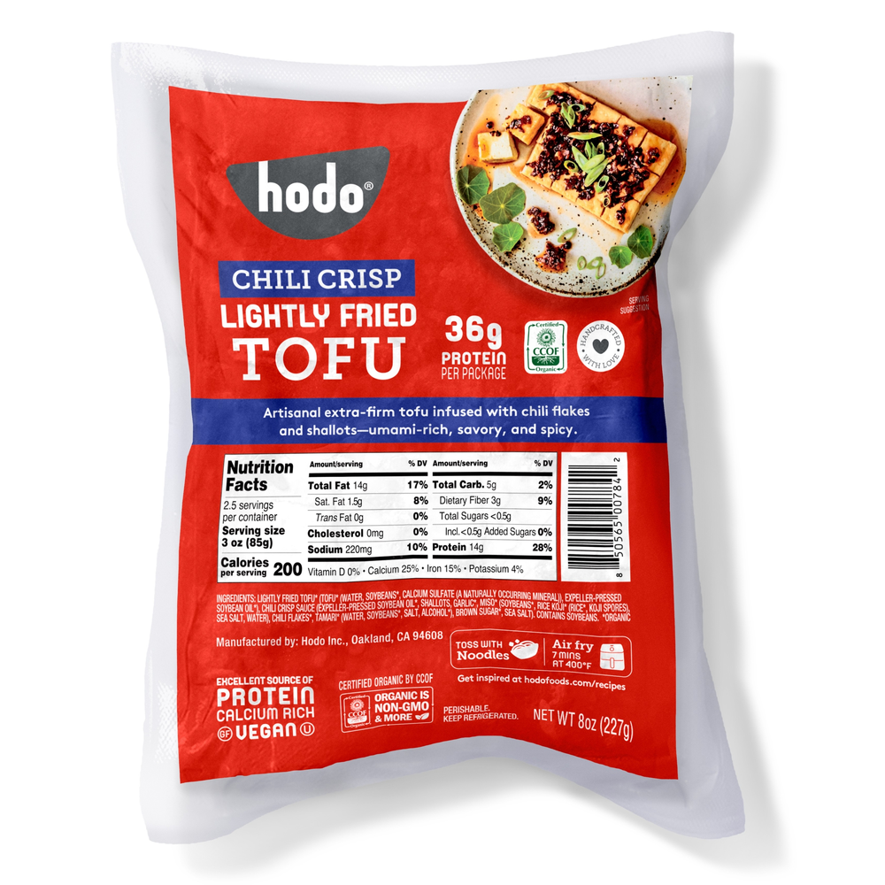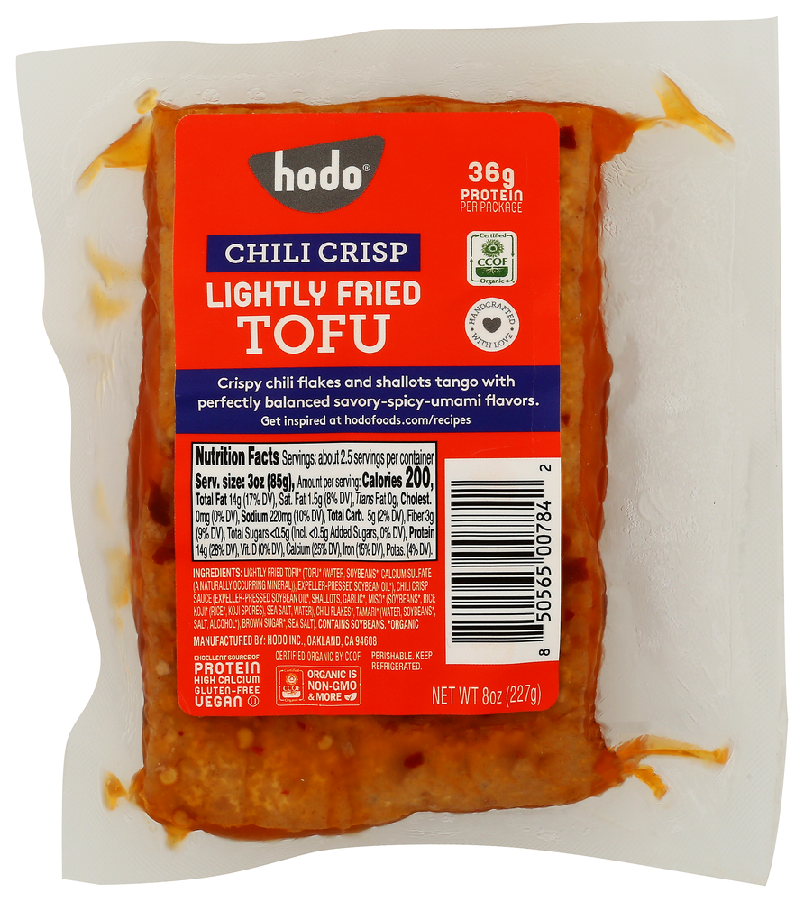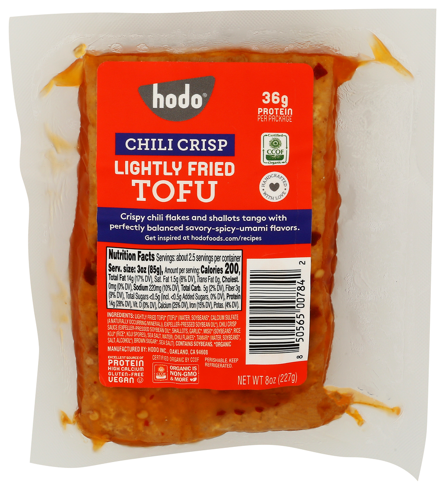 LIGHTLY FRIED TOFU* (TOFU* (WATER, SOYBEANS*, CALCIUM SULFATE (A NATURALLY OCCURRING MINERAL)), EXPELLER-PRESSED SOYBEAN OIL*), CHILI CRISP SAUCE (EXPELLER-PRESSED SOYBEAN OIL*, SHALLOTS, GARLIC*, MISO* (SOYBEANS*, RICE KOJI* (RICE*, KOJI SPORES), SEA SALT, WATER), CHILI FLAKES*, TAMARI* (WATER, SOYBEANS*, SALT, ALCOHOL*), BROWN SUGAR*, SEA SALT).