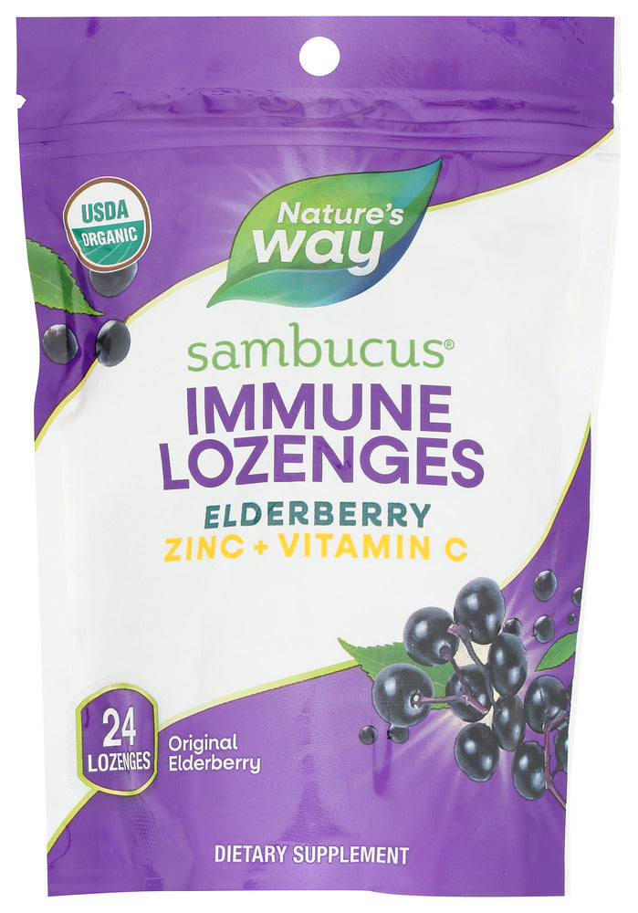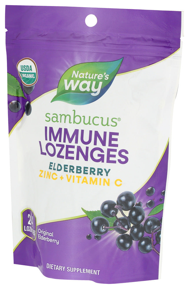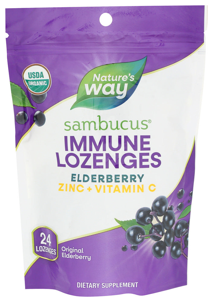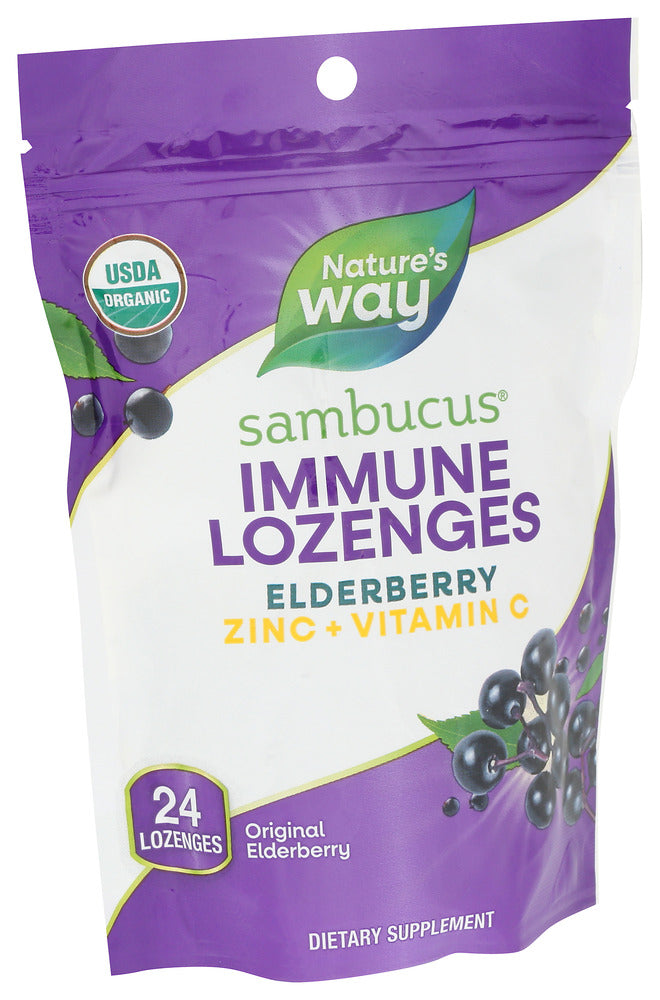NATURE'S WAY ORGANIC SAMBUCUS ZINC LOZENGES CONTAIN EXTRACTS FROM PREMIUM CULTIVARS OF BLACK ELDERBERRY. OUR LOZENGES MAY AID IN THE TREATMENT OF COLD AND FLU SYMPTOMS. BECAUSE THEY PROVIDE VITAMIN C AND ZINC, THEY MAY ALSO BE USED AS A DAILY DIETARY SUPPLEMENT. THIS PACKAGE CONTAINS 24 ELDERBERRY LOZENGES.