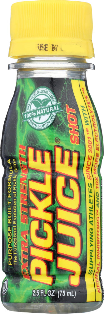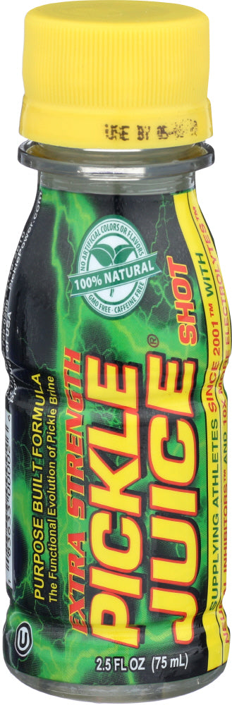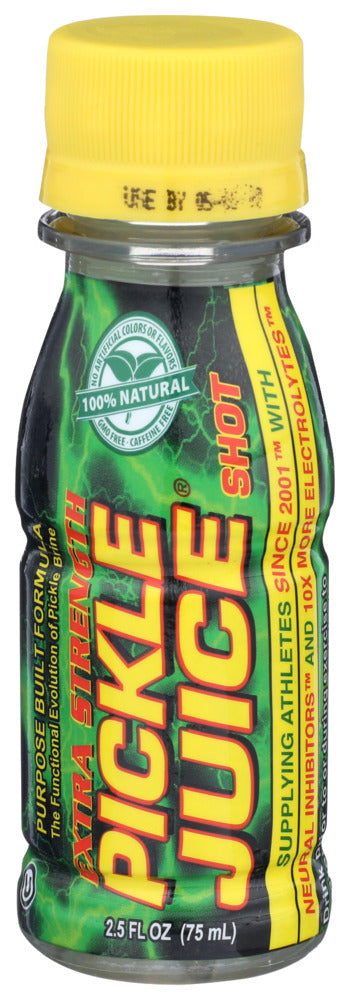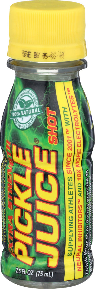 THE PICKLE JUICE COMPANY EXTRA STRENGTH PICKLE JUICE SHOT SUPPLIES NEURAL INHIBITORS AND ELECTROLYTES, INCLUDING 47 MG. OF POTASSIUM, TO HELP PREVENT AND STOP MUSCLE CRAMPS. MADE WITH SIMPLE INGREDIENTS, SUCH AS FILTERED WATER, VINEGAR, SALT AND NATURAL FLAVORS, THIS PICKLE JUICE SHOT GIVES YOU THE ELECTROLYTE REPLACEMENT YOUR BODY NEEDS WITHOUT THE USE OF CAFFEINE, GLUTEN OR SUGAR, MAKING IT SUITABLE FOR INDIVIDUALS WITH VARYING DIETARY NEEDS. THIS 2.5 FL. OZ. BOTTLE OF PICKLE JUICE SHOT IS THE IDEAL SIZE FOR TOSSING IN YOUR GYM BAG OR BACKPACK.