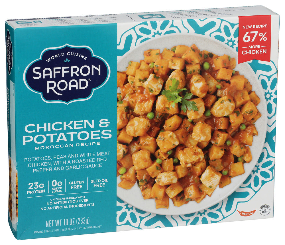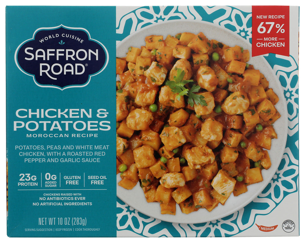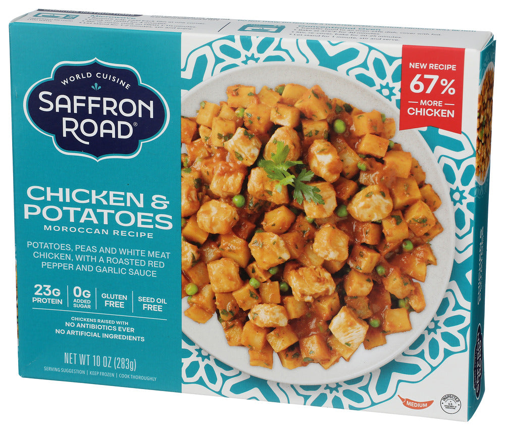 POTATOES, BONELESS WHITE MEAT CHICKEN (CHICKEN BREAST, WATER, NATIVE RICE STARCH, SEA SALT), GREEN PEAS, WATER, RED BELL PEPPERS, ROASTED RED PEPPERS, ONIONS, TOMATO PUREE, TOMATO PASTE, CONTAINS 2% OR LESS OF: EXPELLER PRESSED SUNFLOWER OIL, GARLIC, LEMON JUICE, SPICES, SEA SALT, RED CHILI PEPPERS, PAPRIKA.