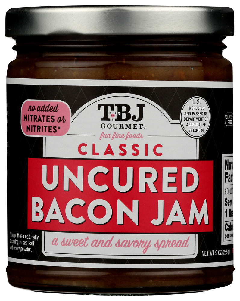 UNCURED BACON NO NITRITES OR NITRATES ADDED* (PORK, WATER, SALT, SUGAR, CELERY POWDER. MAY CONTAIN: CHERRY POWDER, NATURAL SMOKE FLAVOR, SODIUM LACTATE, SPICE EXTRACTIVES), ONIONS, BROWN SUGAR, APPLE CIDER VINEGAR, MOLASSES, RAW CANE SUGAR. CONTAINS 2% OR LESS OF: PECTIN, CITRIC ACID (ACIDITY REGULATOR), GARLIC POWDER, ONION POWDER, SEA SALT, XANTHAN GUM, GUAR GUM.