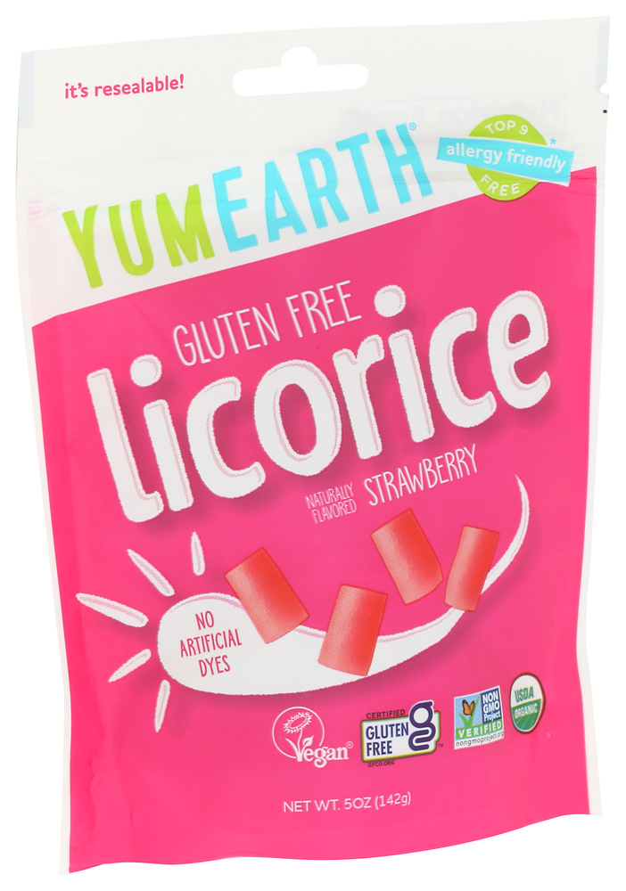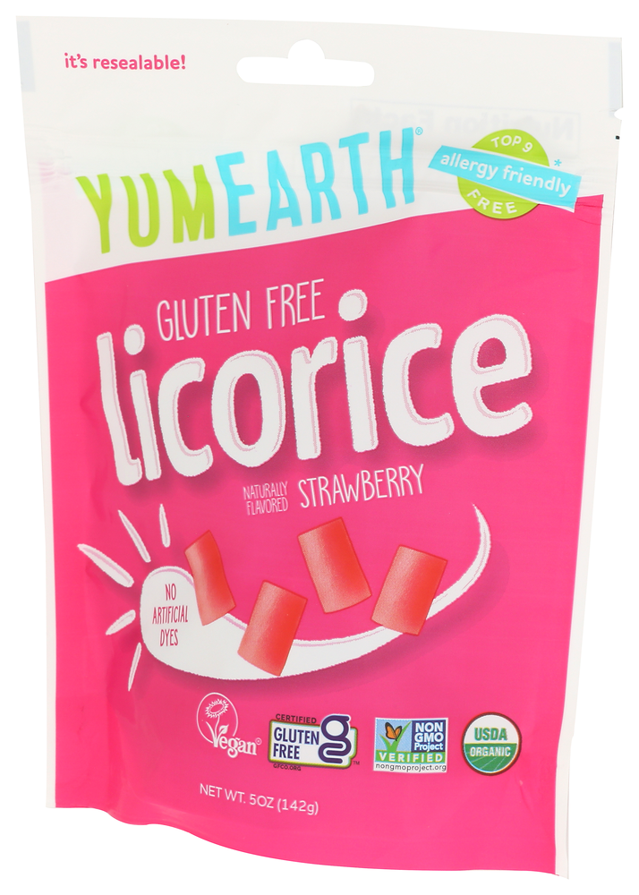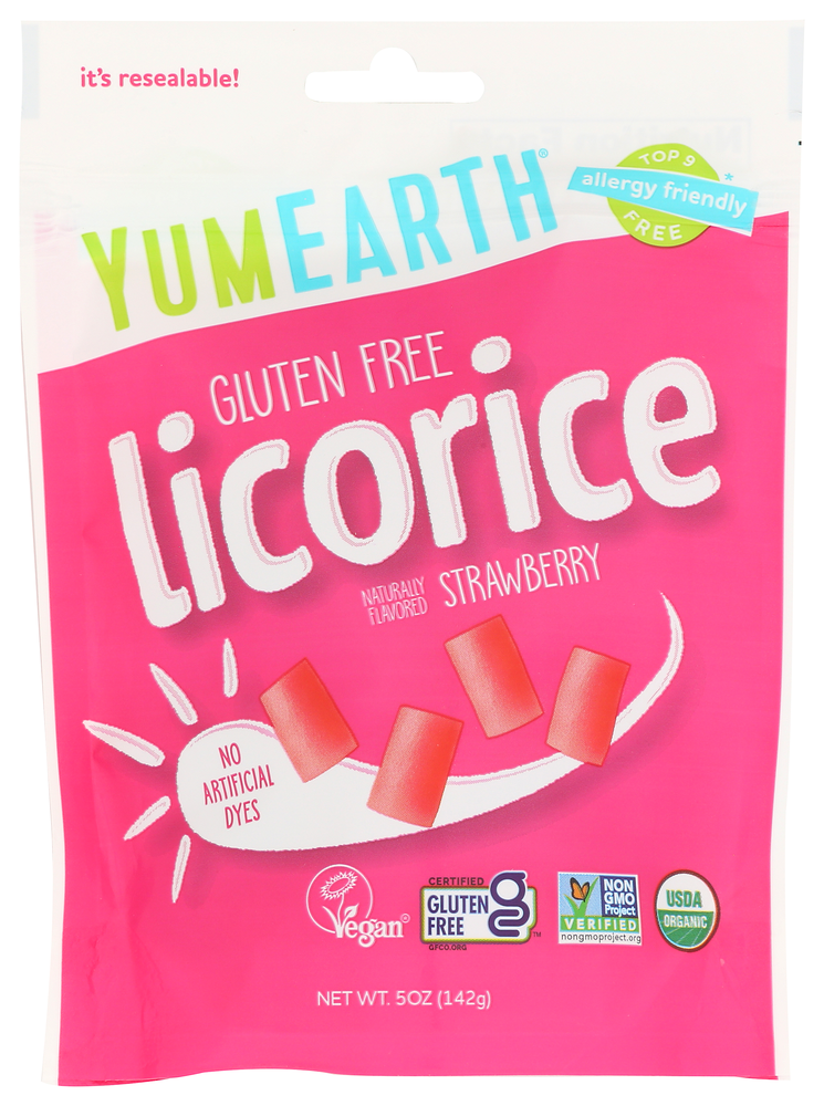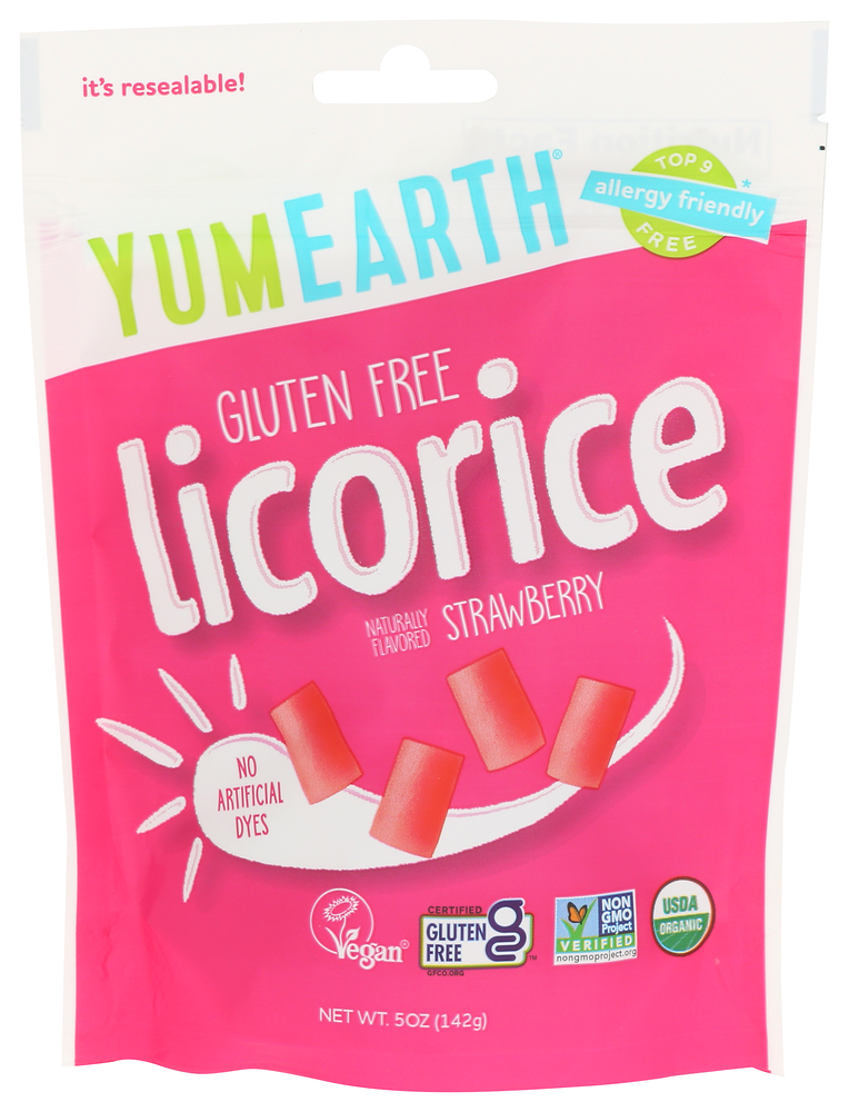 YUMEARTH STRAWBERRY LICORICE, ORGANIC IS A DELICIOUS AND HEALTHY ORGANIC SNACK YOU WON'T MIND YOUR KIDS EATING. IT'S FLAVORED AND COLORED WITH REAL FRUIT JUICE. THIS CANDY IS GLUTEN-FREE AND NON-GMO. IT IS FREE OF HIGH FRUCTOSE CORN SYRUP, EGGS, DAIRY AND PEANUTS. EACH PACKET CONTAINS 5 OZ. OF CANDY.