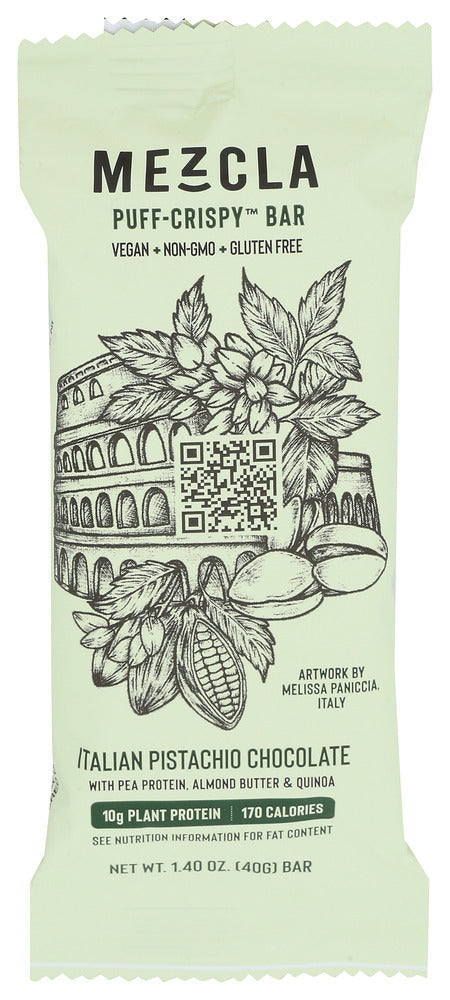 PEA CRISPS (PEA PROTEIN, RICE STARCH), TAPIOCA SYRUP, ORGANIC DARK CHOCOLATE (ORGANIC CANE SUGAR, ORGANIC CHOCOLATE LIQUOR, ORGANIC COCOA BUTTER, ORGANIC VANILLA POWDER), VEGETABLE GLYCERINE, ALMOND BUTTER, QUINOA CRISPS (QUINOA), PREBIOTIC SOLUBLE TAPIOCA FIBER, TAPIOCA FIBER, PISTACHIOS, PEA PROTEIN, COCONUT OIL, VANILLA EXTRACT, NATURAL FLAVOR, SEA SALT, HAZELNUTS.