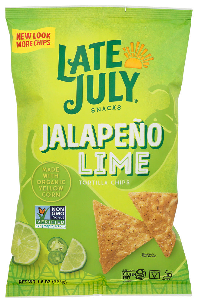 ORGANIC WHOLE GROUND YELLOW CORN, SUNFLOWER OIL AND/OR SAFFLOWER OIL, JALAPENO LIME SEASONING (MALTODEXTRIN, DEXTROSE, SEA SALT, JALAPENO PEPPER, GREEN BELL PEPPER POWDER, ONION POWDER, GARLIC POWDER, VINEGAR POWDER [MALTODEXTRIN, WHITE DISTILLED VINEGAR], YEAST EXTRACT, SPICES, LIME JUICE POWDER [MALTODEXTRIN, LIME JUICE], CITRIC ACID).