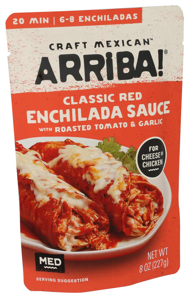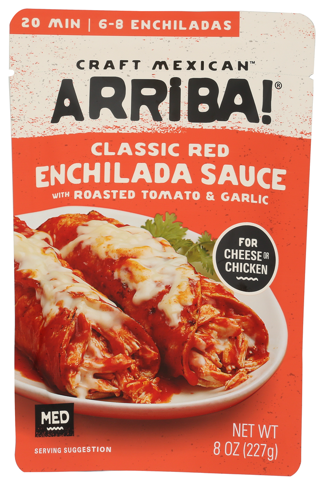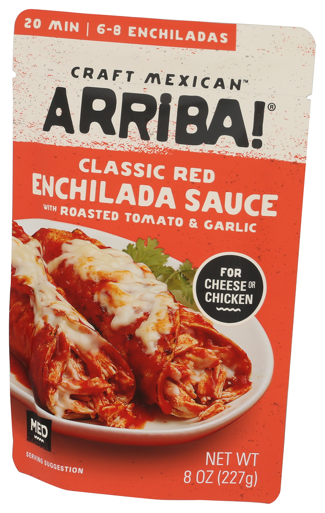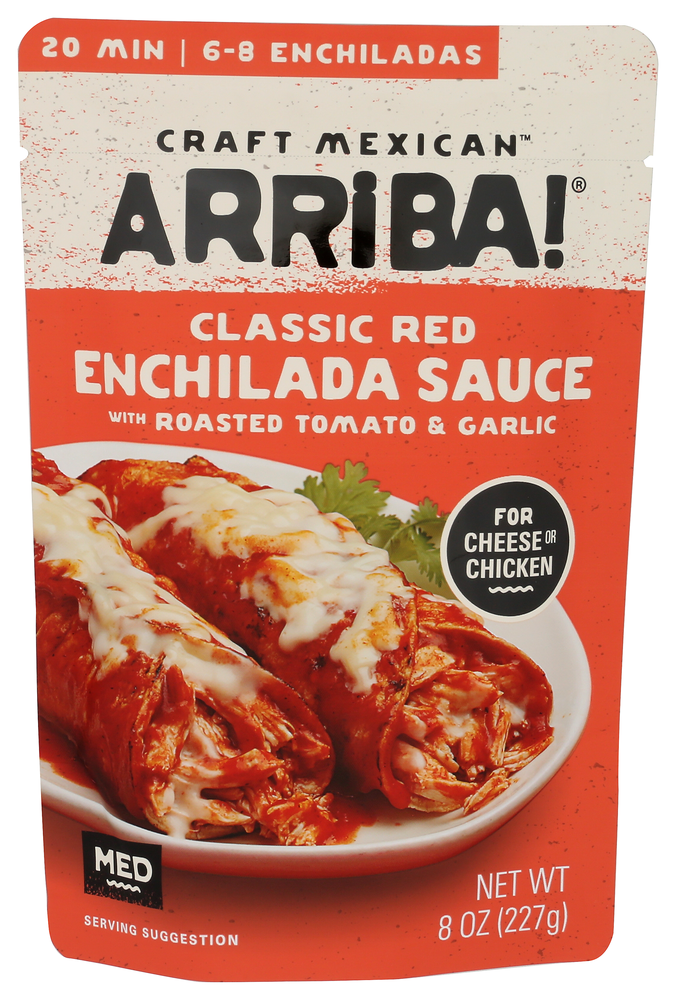 - CLASSIC CHICKEN ENCHILADAS 20 MIN | MAKES 6-8 ENCHILADAS HERE'S WHAT YOU'LL NEED TORTILLAS 6-8 CORN TORTILLAS CHICKEN 1 CUP COOKED, SHREDDED CHICKEN CHEESE 1½ CUPS SHREDDED CHEESE (MONTEREY JACK) FLAVOR 1 POUCH ARRIBA CLASSIC RED ENCHILADA SAUCE + COOKING OIL LET'S GET COOKING 1 PREHEAT OVEN TO 400°F. BRUSH TORTILLAS WITH OIL, WRAP IN A DAMP PAPER TOWEL, AND MICROWAVE FOR 1 MINUTE. 2 MIX CHICKEN WITH ½ CUP CHEESE. FILL EACH TORTILLA WITH ¼ CUP FILLING, ROLL, AND PLACE SEAM-SIDE DOWN IN AN 8" SQUARE BAKING DISH. POUR ENCHILADA SAUCE OVER AND TOP WITH REMAINING CHEESE. 3 BAKE UNCOVERED FOR 10-15 MINUTES UNTIL BUBBLY.