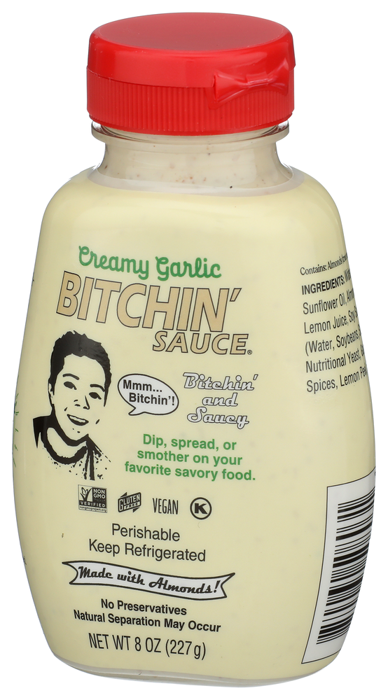 Creamy Garlic Bitchin’ Sauce features a smooth texture with a velvety, luscious flavor. Addictive in taste, it’s a simple blend of almonds, real herbs & spices – not much else! Bitchin’ Sauce is the perfect +1 for every saucy BBQ, party, or cookout. Squeeze or drizzle on your favorite savory foods from pizza to pasta! Bitchin’ - Adj. Wonderful, First Rate, Excellent. Adv. Extremely Bitchin' good!
