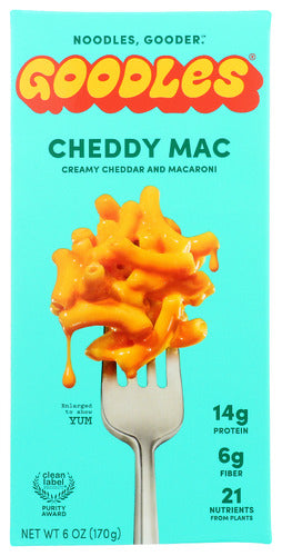 GOODLES NOODLES (WHEAT FLOUR, CHICKPEA PROTEIN, WHEAT PROTEIN, NUTRIENTS EXTRACTED FROM [BROCCOLI*, SPINACH*, KALE*, PUMPKIN*, SWEET POTATO*, SUNFLOWER SEED*, CRANBERRY* CHLORELLA*, MAITAKE MUSHROOM*, SHIITAKE MUSHROOM*]), CHEDDAR CHEESE BLEND (CULTURED MILK, WHEY, BUTTERMILK, SALT, DISODIUM PHOSPHATE, COLOR [ANNATTO, PAPRIKA, TURMERIC], ENZYMES), BUTTER (CREAM, SALT, ENZYMES), SALT, TAPIOCA FLOUR, DRIED MAPLE SYRUP, LACTIC ACID.