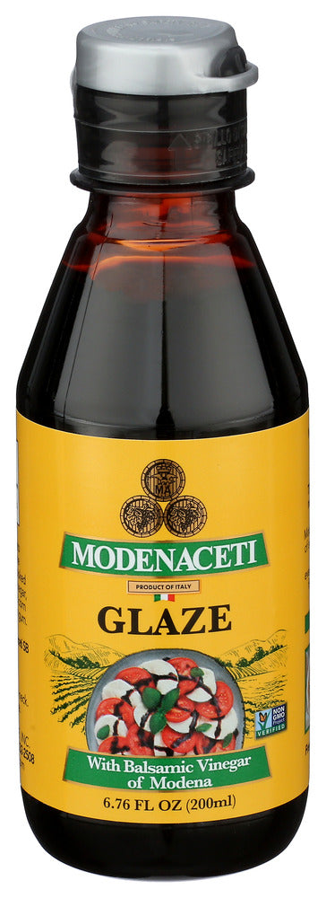 MODENACETI’S BALSAMIC GLAZE IS A BALSAMIC VINEGAR OF MODENA. EACH 6.76 FL. OZ. BOTTLE CONTAINS 13 ONE TABLESPOON SERVINGS. OUR BALSAMIC GLAZE DOES NOT CONTAIN ARTIFICIAL INGREDIENTS OR FILLERS AND WE DO NOT ADD SUGAR. USE AS A FINISHING GLAZE FOR MEAT, CHICKEN OR FISH OR EVEN AS A DESSERT TOPPING FOR FRUITS AND ICE CREAM.