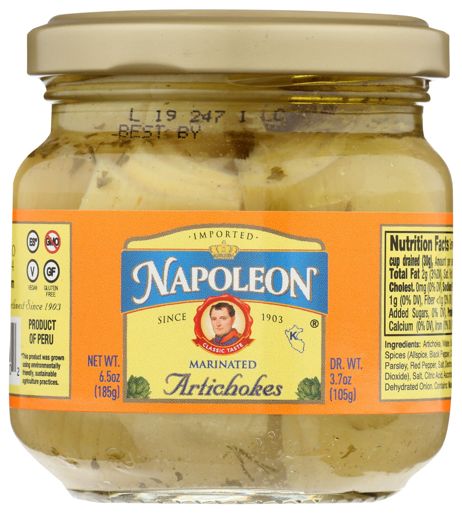ARTICHOKE, WATER, SUNFLOWER OIL, DISTILLED VINEGAR, SPICES (ALLSPICE, BLACK PEPPER, CINNAMON, MUSTARD, OREGANO, PARSLEY, RED PEPPER, SALT, DEXTROSE, ASCORBIC ACID AND SILICON DIOXIDE), SALT, CITRIC ACID, ASCORBIC ACID, DEHYDRATED GARLIC AND DEHYDRATED ONION.